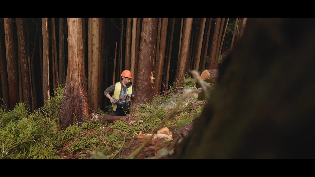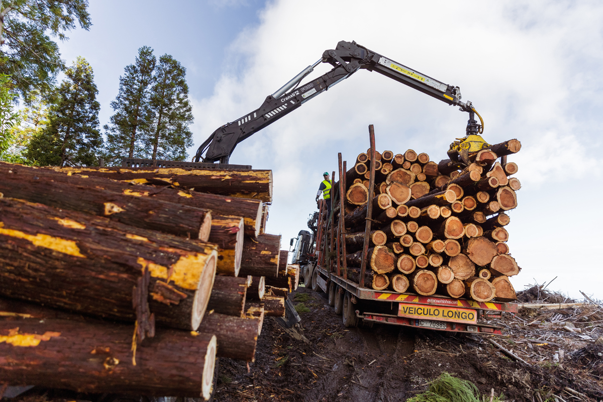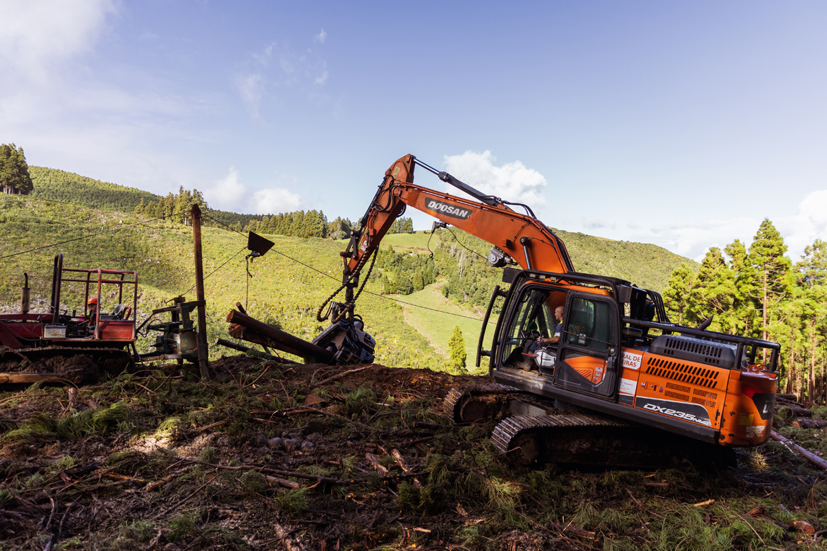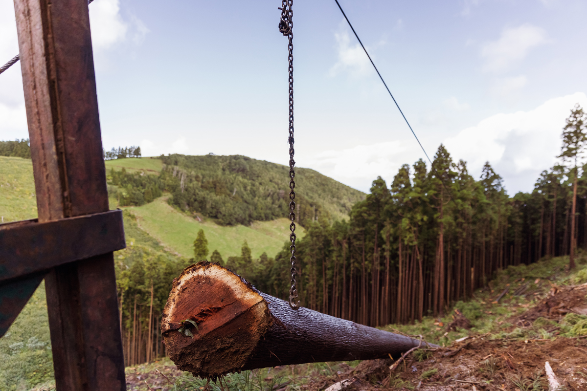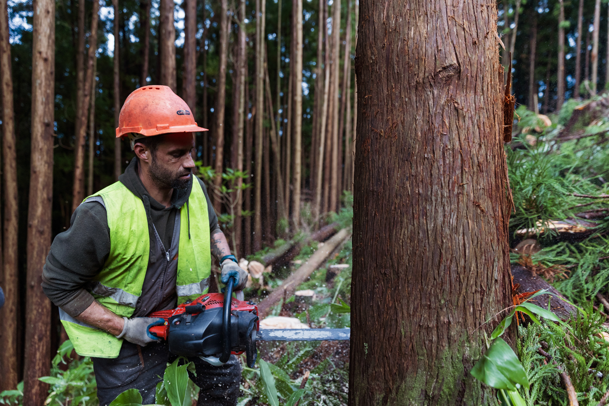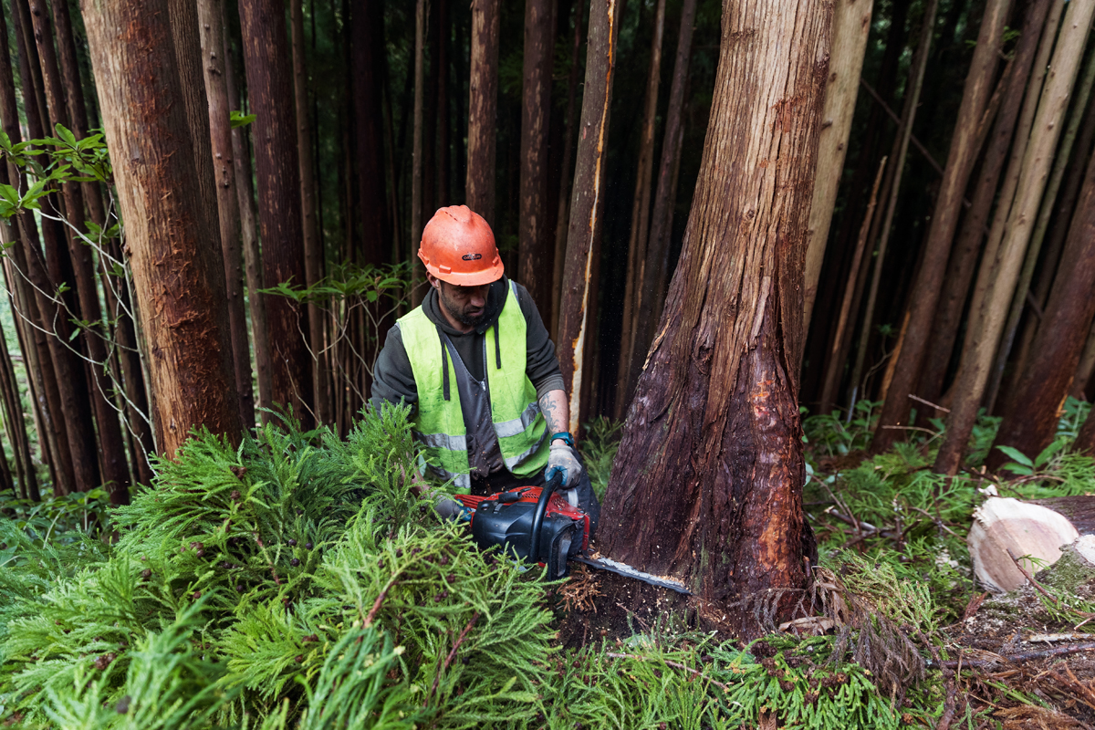 Numa paisagem deslumbrante, a equipa MBRUM efetua o corte de árvores de criptoméria. Estão numa floresta,