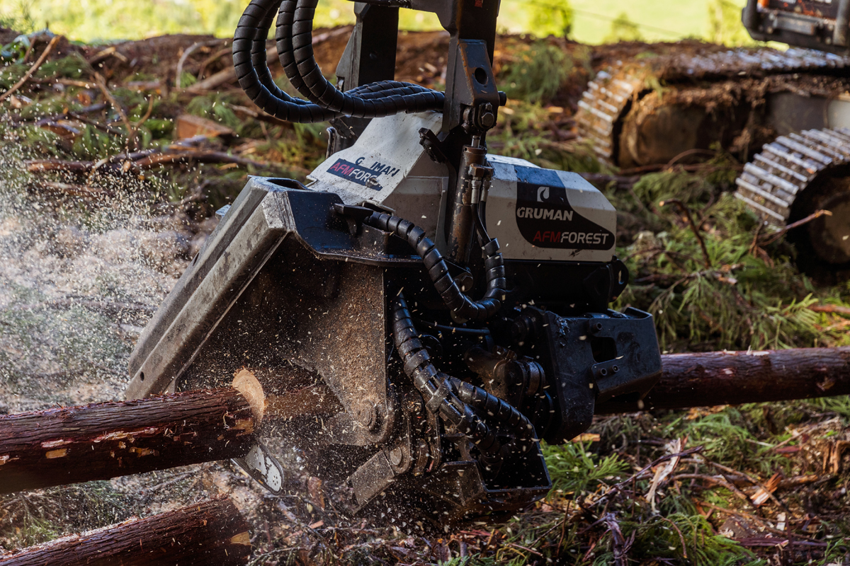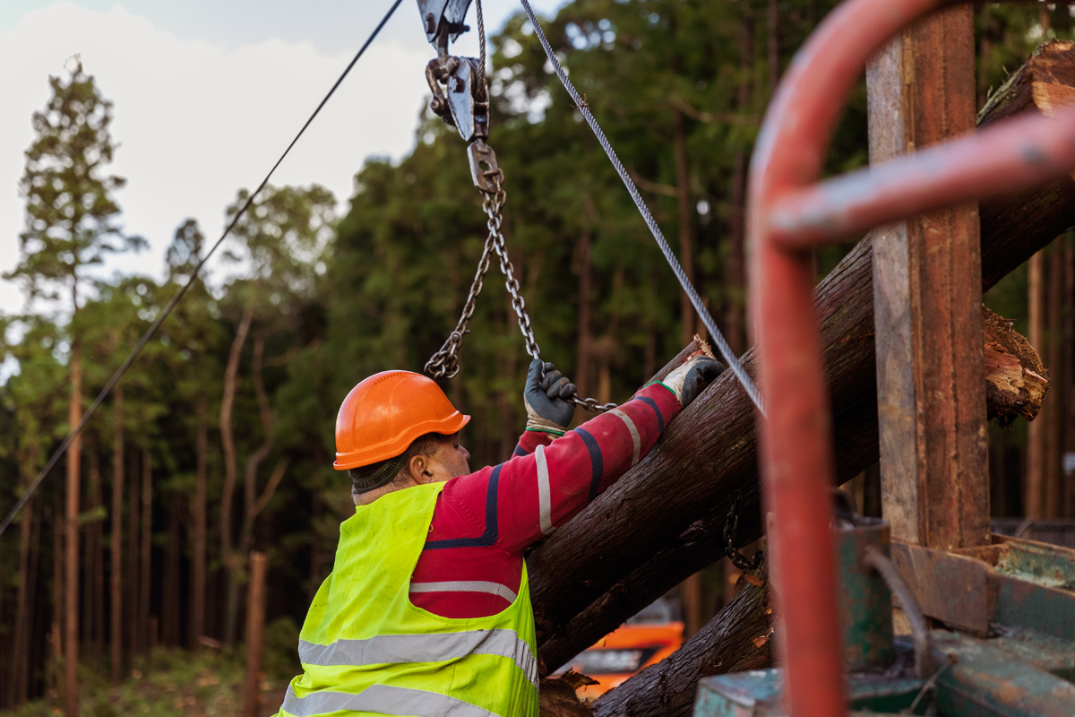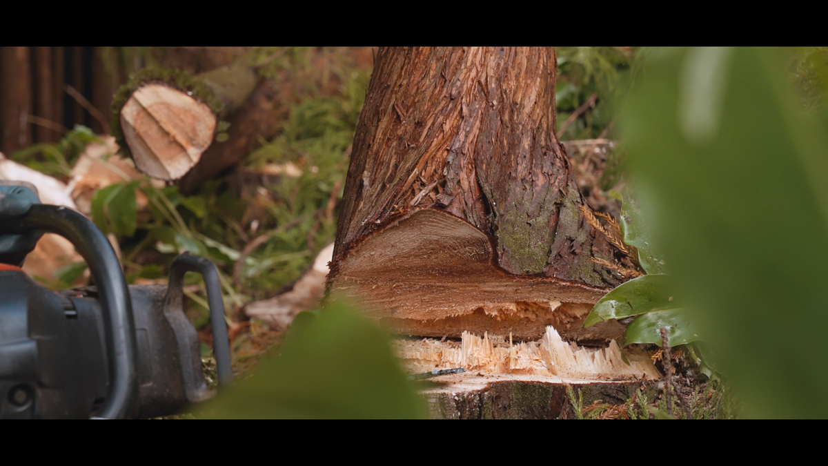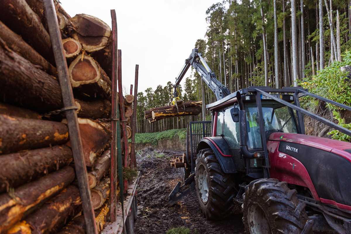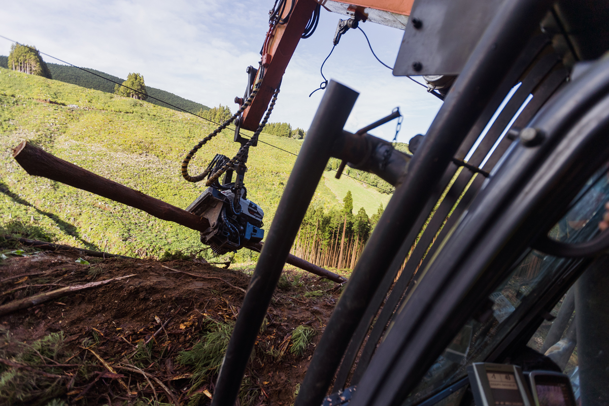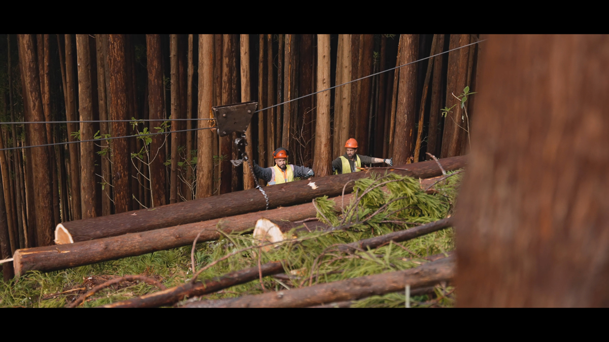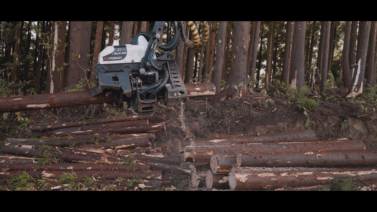 Numa paisagem deslumbrante, a equipa MBRUM efetua o corte de árvores de criptoméria. Estão numa floresta,